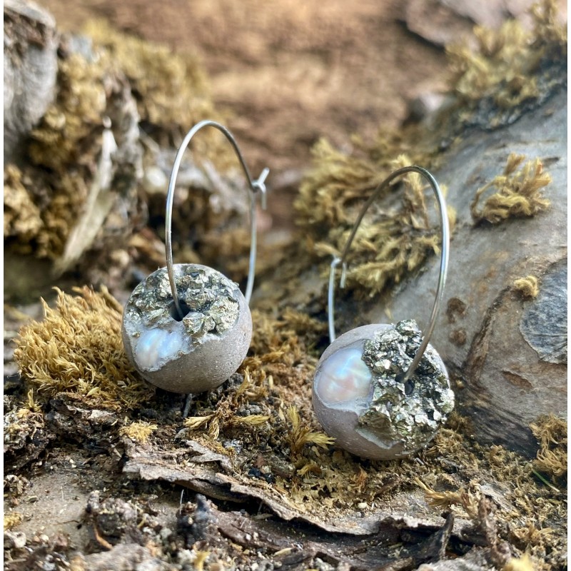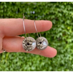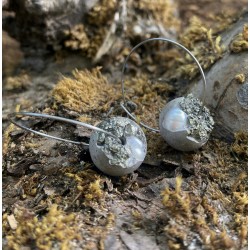 Náušnice (kruhové) s bílou říční perlou a pyritem